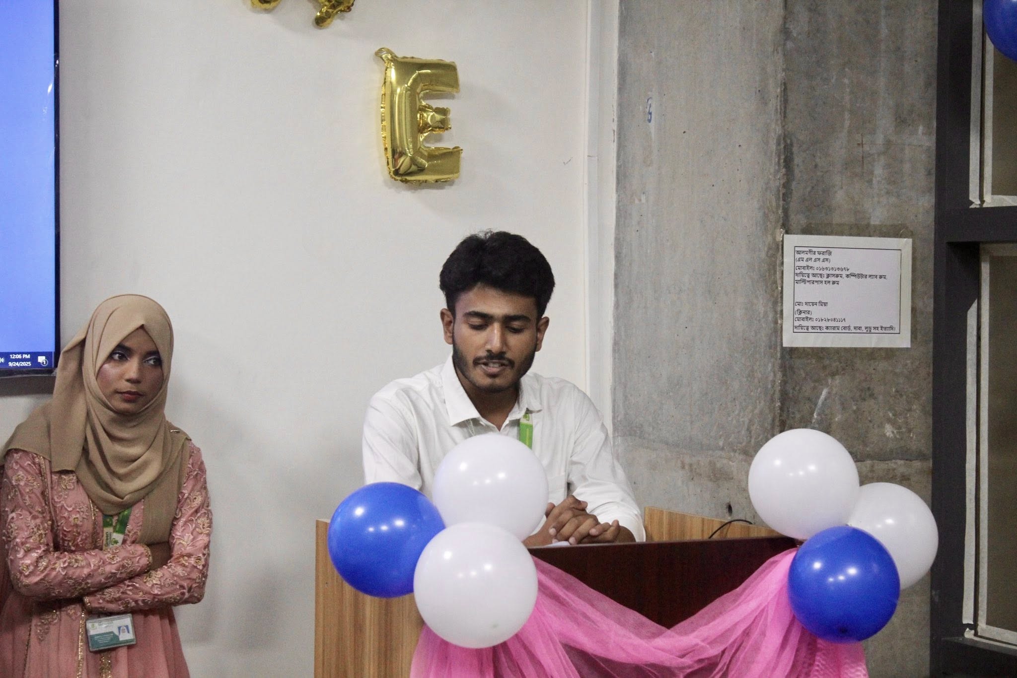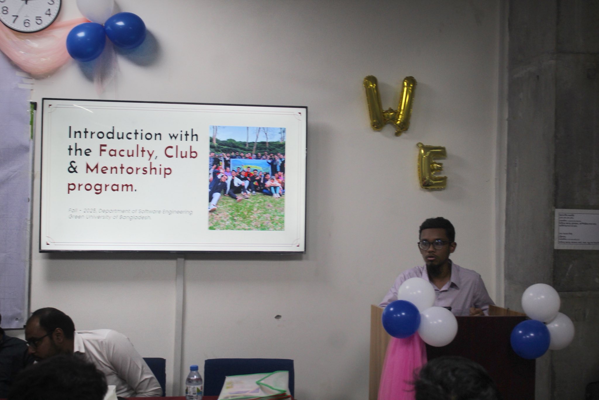 This was followed by a warm and heartfelt welcome speech by Dipankar Sarkar (Batch 242), where he shared valuable and relatable experiences as a senior student, creating an immediate connection with the freshers. Next, the audience enjoyed a captivating and well-crafted video documentary on the Department of Software Engineering, presented by Md. Adil Hossain (Batch 251). This gave the newcomers a vivid glimpse into the department’s achievements, culture, and opportunities. Tayebur Rahman Fahim (Batch 242) then offered a clear and informative introduction of faculty members and club members, ensuring that new students felt welcomed and supported by the department’s vibrant community.