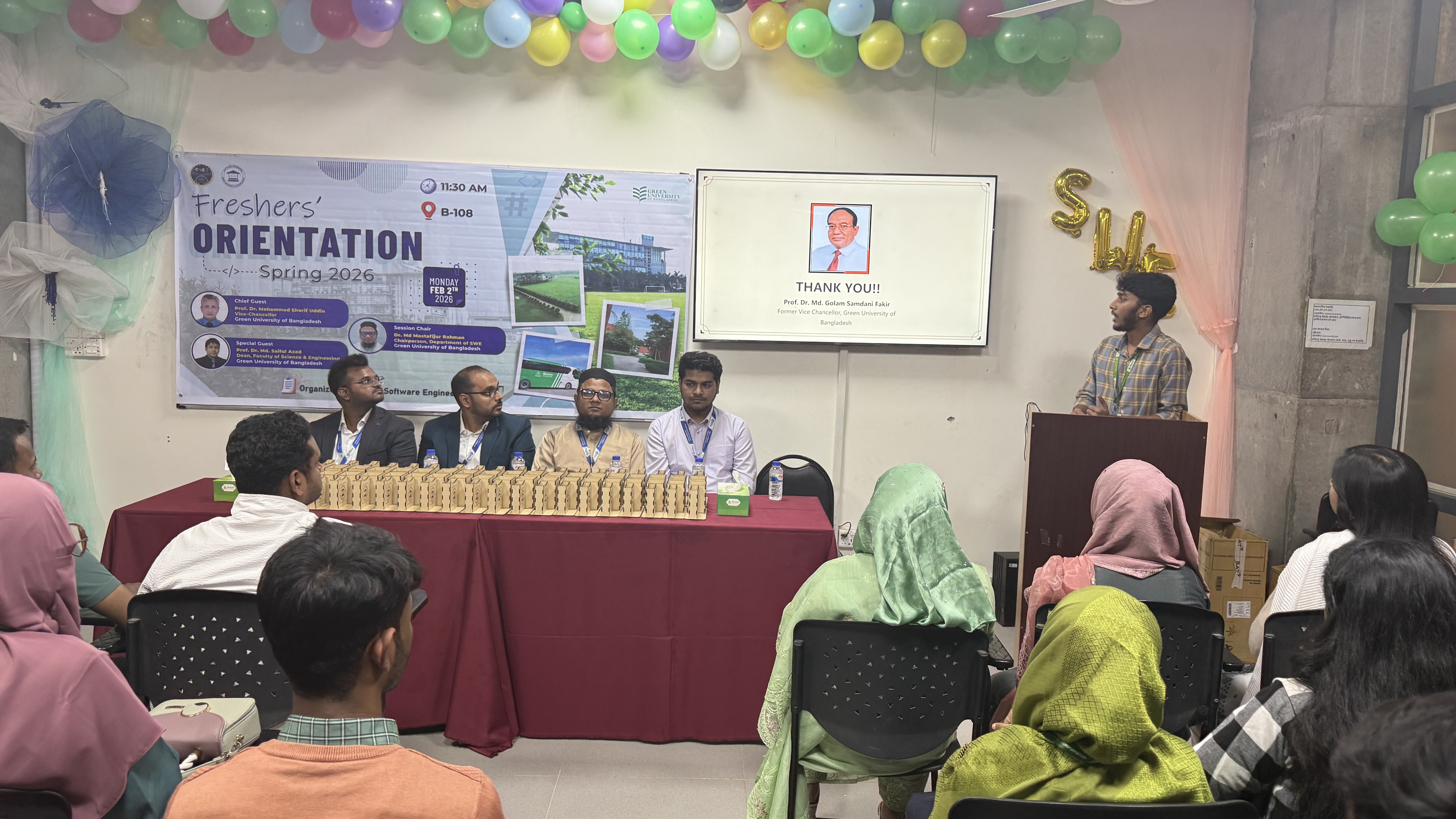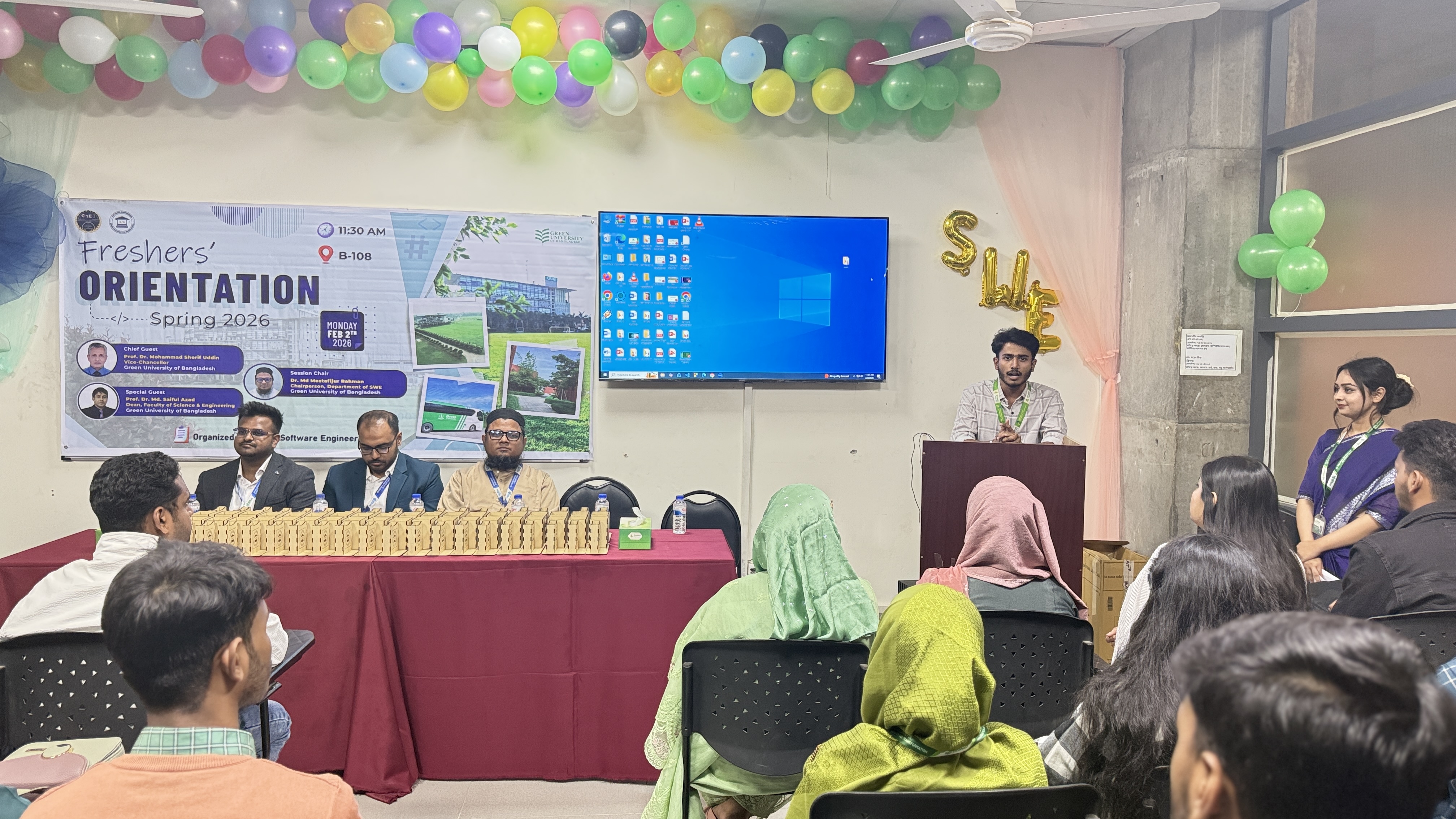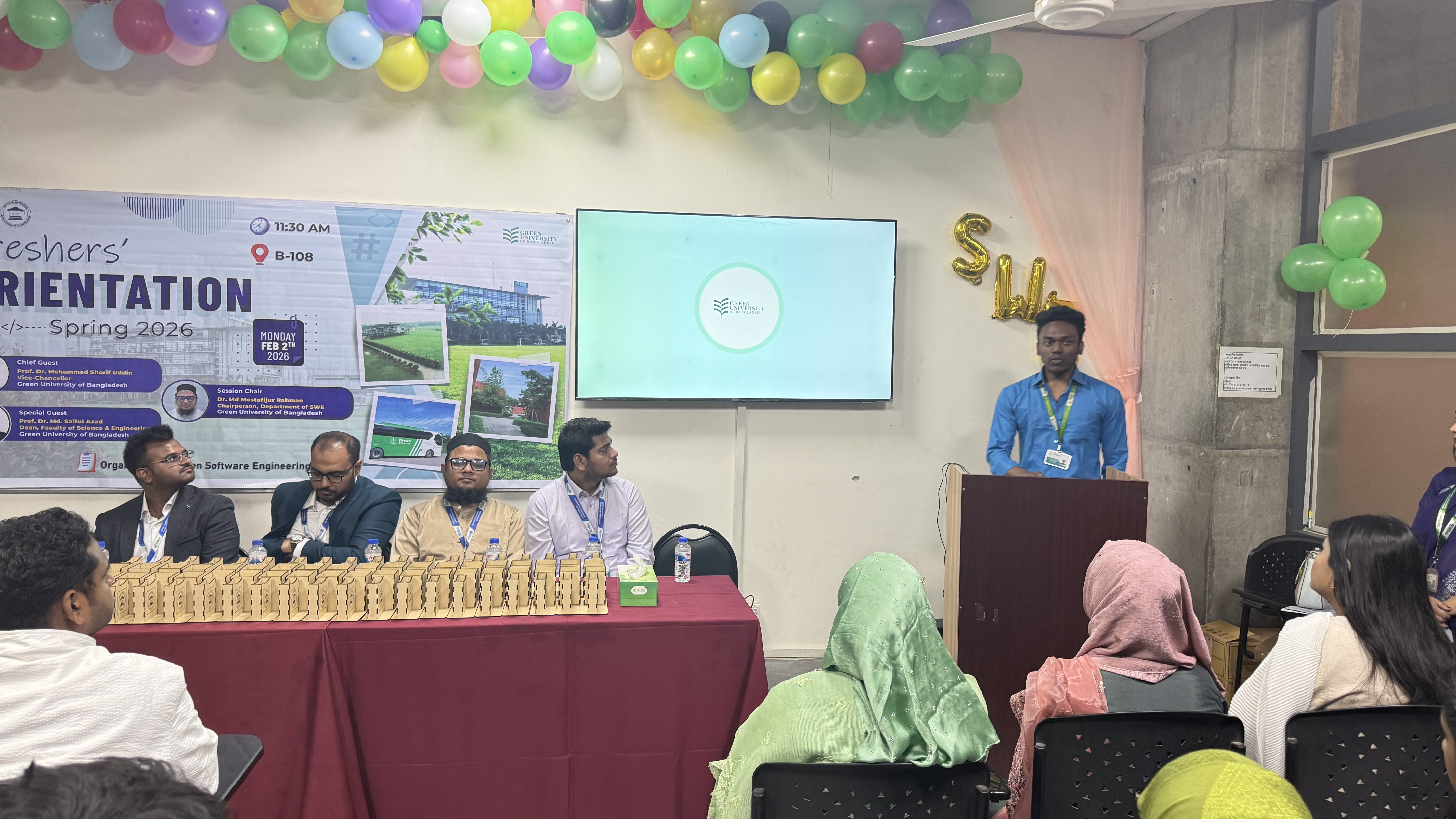 The Department of Software Engineering (SWE), Green University of Bangladesh, successfully organized the Freshers’ Orientation Program Spring 2026 on February 2, 2026, at 11:30 AM in Room B-108. The program was arranged by the Green Software Engineering Club to warmly welcome the newly admitted students of the Spring 2026 semester and introduce them to the department’s academic culture, values, and support systems.