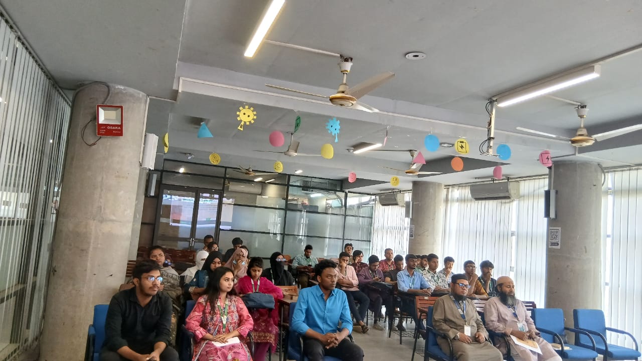Subsequently, Ms. Zakia Sultana Tamanna, Library Officer, conducted an interactive and hands-on demonstration of the library’s services. She guided students on how to search for books, access e-resources, and effectively use the available facilities to support their academic and research needs.