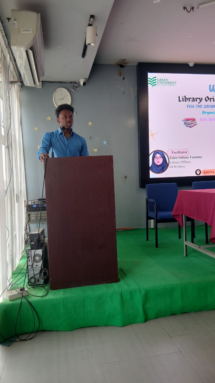 The Green University Library successfully conducted a Library Orientation Program for the Department of Software Engineering (SWE) on 22 February 2026 at 9:00 AM in Conference Room A-302, Admin Building. The session aimed to familiarize students with the library’s resources, services, and facilities, while providing practical guidance on their effective use for academic success.